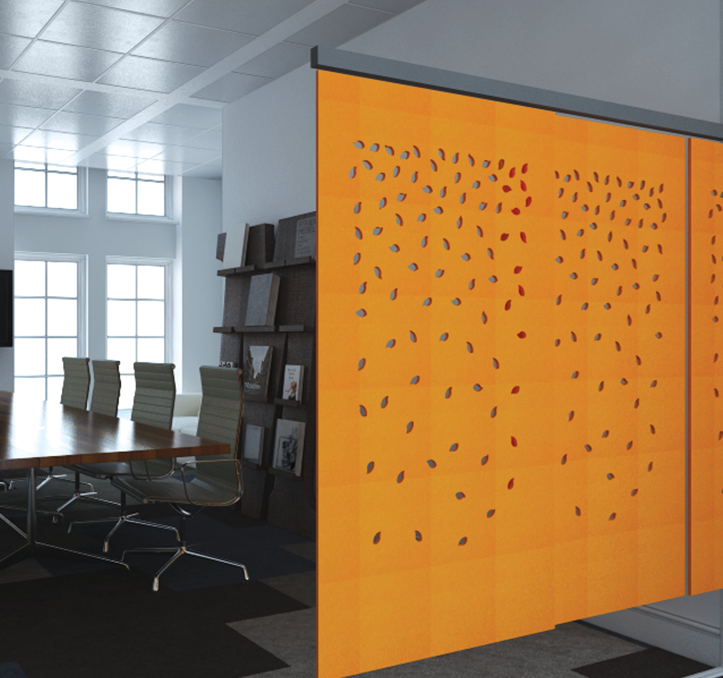 Висяща акустична преграда, изработена от филц с лазерно изрязване с флорални мотиви. Размери 120/250 см.